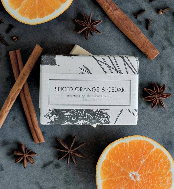 Shea Butter Soap in Spiced Orange & Cedar Holiday Blend. Spiced Orange & Cedar is a warm and rich blend perfect for the holiday season. We mix Sweet Orange essential oil with earthy cedar and spices. Our holiday scents do tend to sell out before December so get your orders in!
