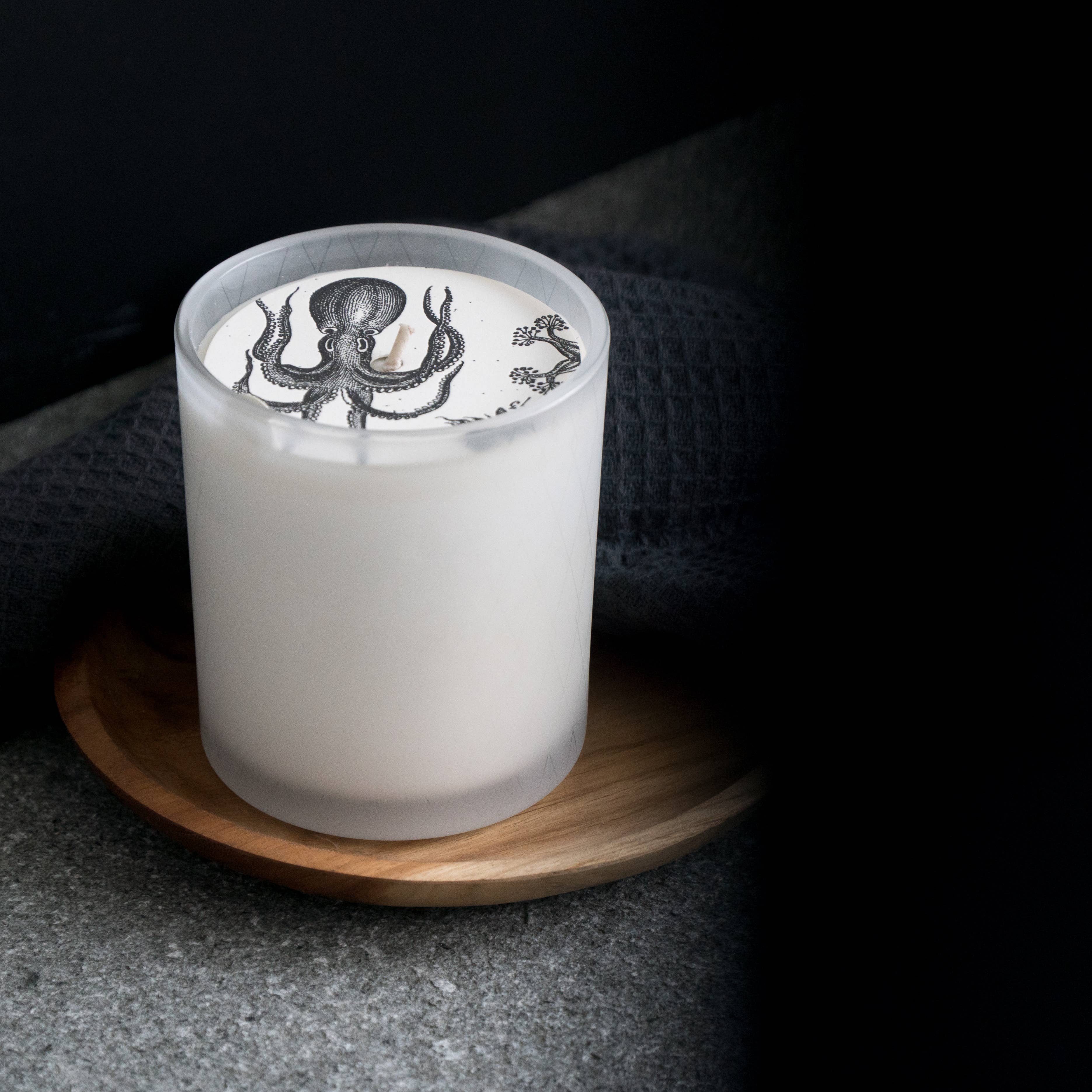 Hand poured into reusable etched glass jars, each candle burns evenly and cleanly for over 80+ hours. (3.25" around 4" tall)