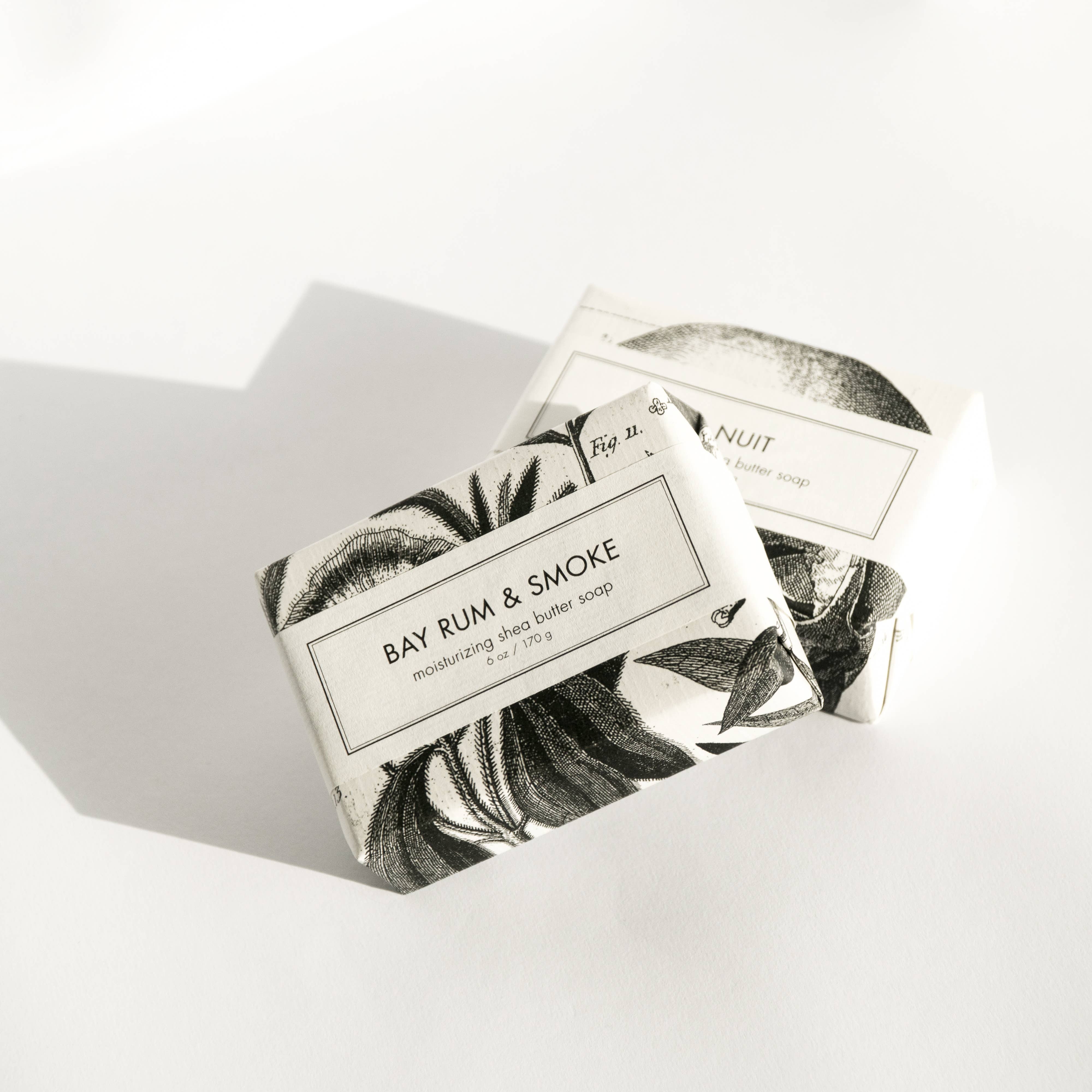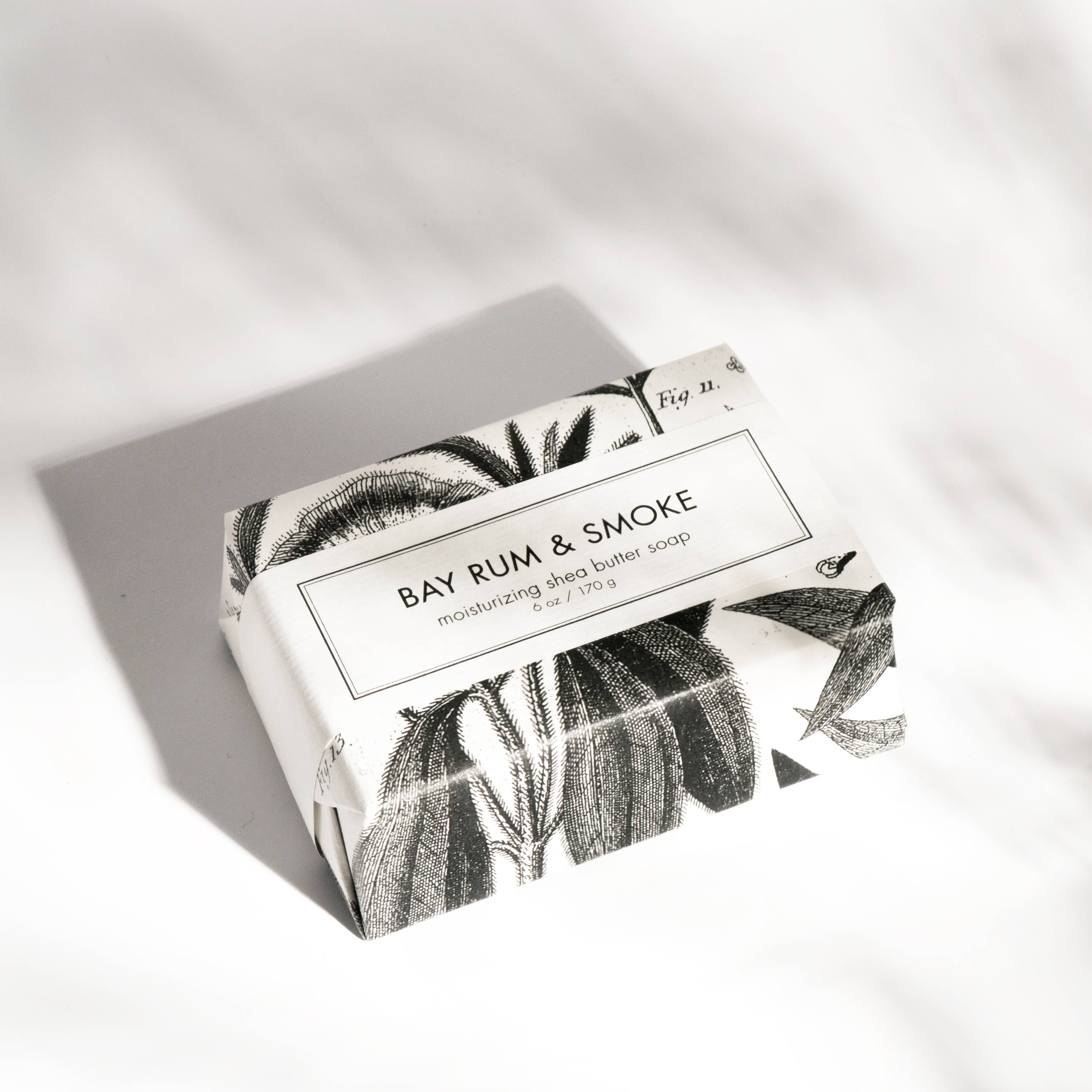 Shea Butter Soap in Bay Rum & Smoke: masculine and clean. A combination of roasted tea leaves, tobacco, cedarwood & Sicilian lemon. Reminiscent of an old fashioned aftershave.